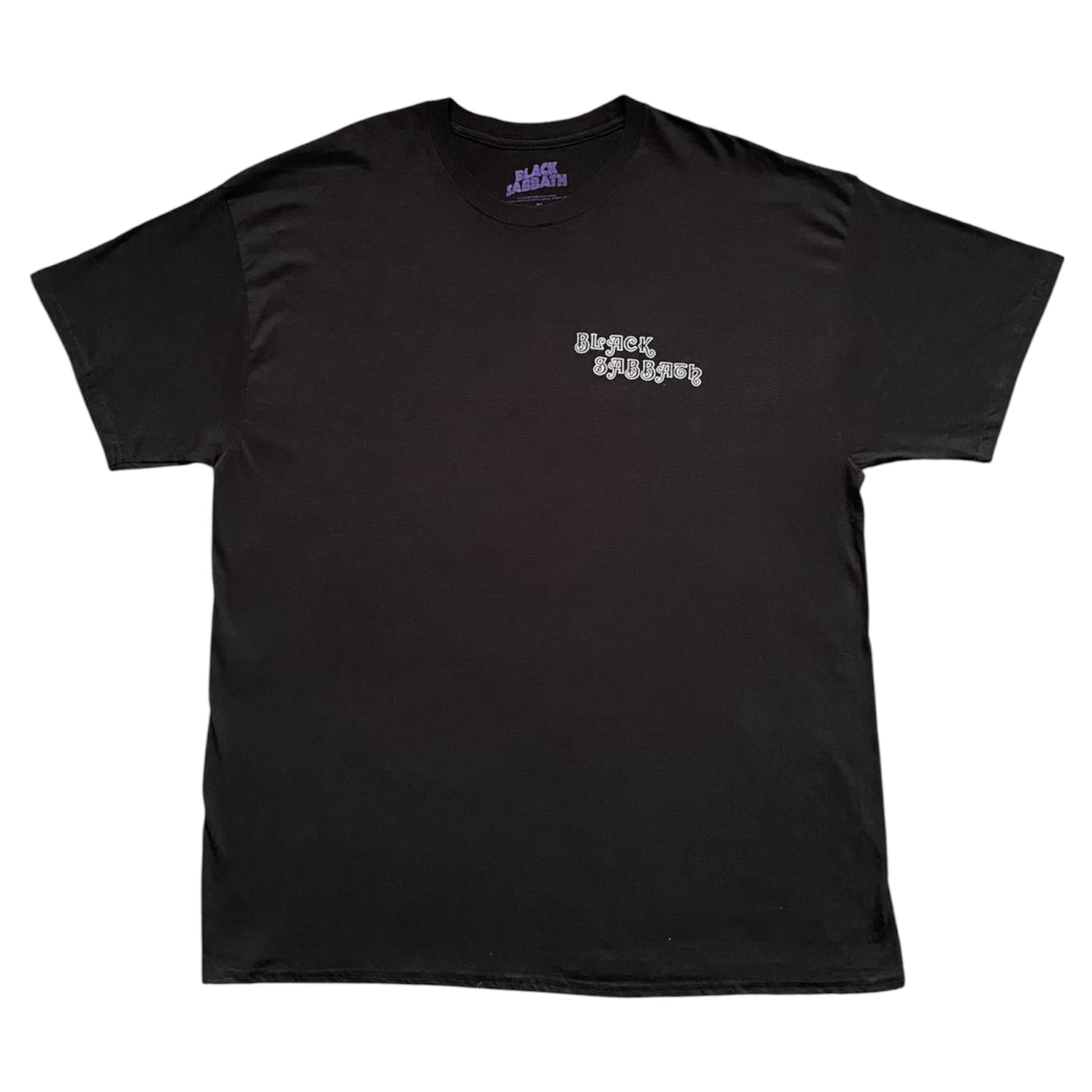 A Black Sabbath T-shirt with a back print of the self titled album Black Sabbath. This T-shirt has a purposefully worn vintage look.